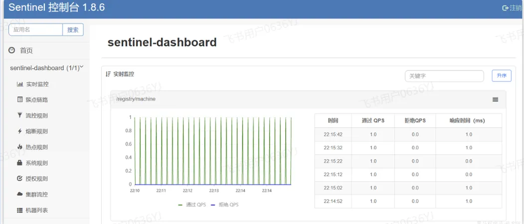 登录后,即可看到控制台,默认会监控sentinel-dashboard服务本身: