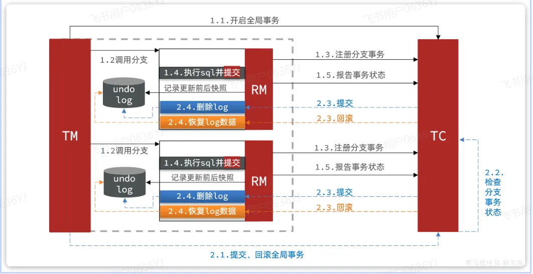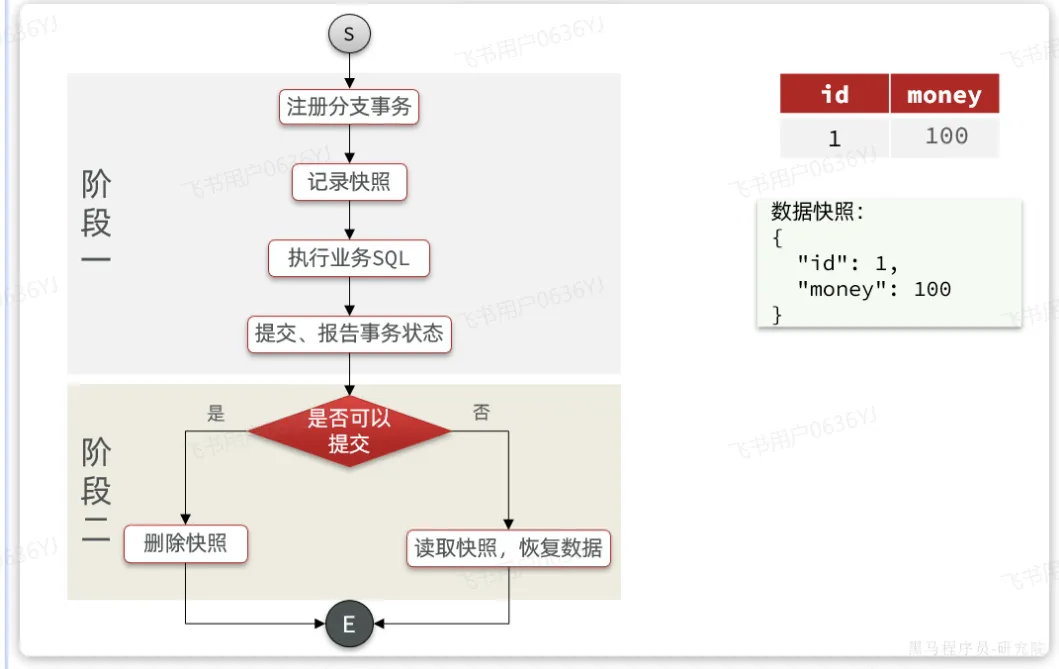 - 如果有分支事务失败,需要回滚。读取快照数据({"id": 1, "money": 100}),将快照恢复到数据库。此时数据库再次恢复为100