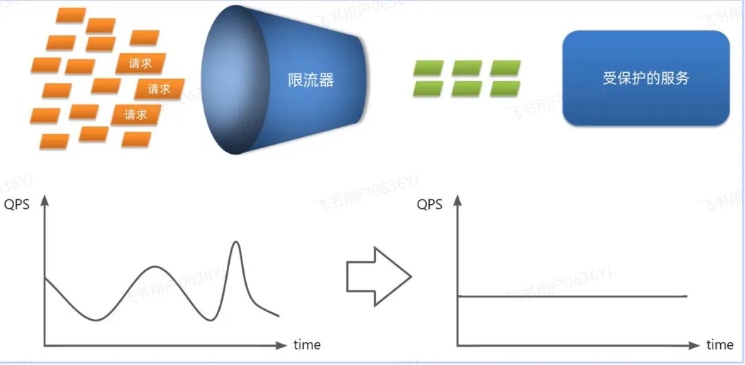 请求限流往往会有一个限流器,数量高低起伏的并发请求曲线,经过限流器就变的非常平稳。这就像是水电站的大坝,起到蓄水的作用,可以通过开关控制水流出的大小,让下游水流始终维持在一个平稳的量。