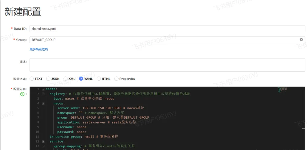 首先,我们要在配置文件中指定要采用的分布式事务模式。我们可以在Nacos中的共享shared-seata.yaml配置文件中设置: