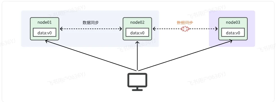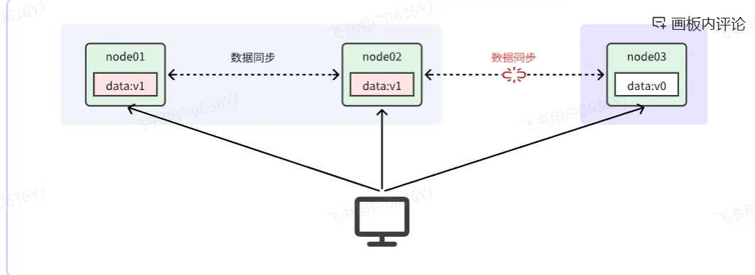由于网络故障,当我们把数据写入node01时,可以与node02完成数据同步,但是无法同步给node03。现在有两种选择: