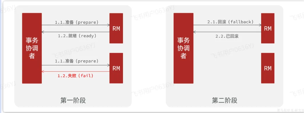 - 如果一阶段任意一个参与者失败,则通知所有事务参与者回滚事务