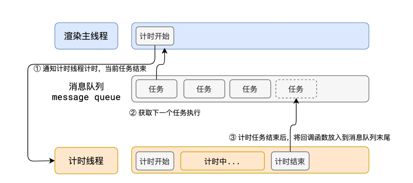 在 Chrome 的源码中,它开启一个不会结束的 for 循环,每次循环从消息队列中取出第一个任务执行,而其他线程只需要在合适的时候将任务加入到队列末尾即可。