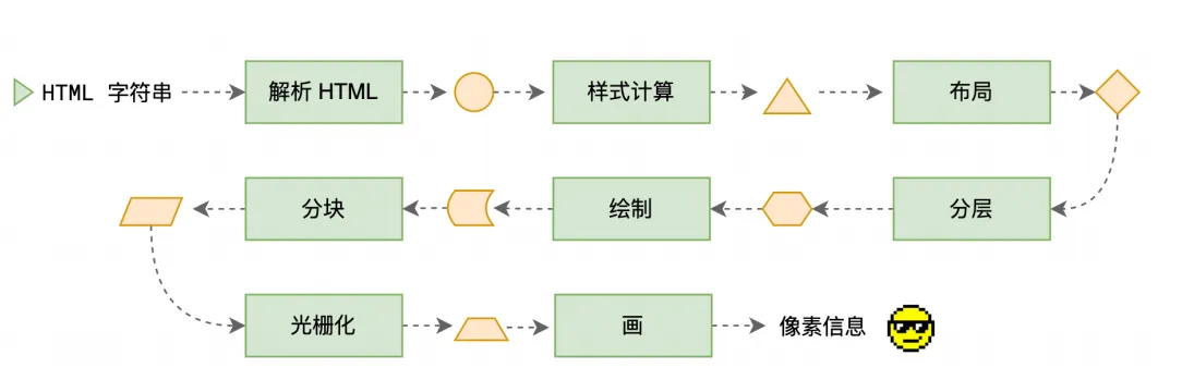 整个渲染流程分为多个阶段,分别是: HTML 解析、样式计算、布局、分层、绘制、分块、光栅化、绘画。每个阶段都有明确的输入输出,上一个阶段的输出会成为下一个阶段的输入。这样,整个渲染流程就形成了一套组织严密的生产流水线。