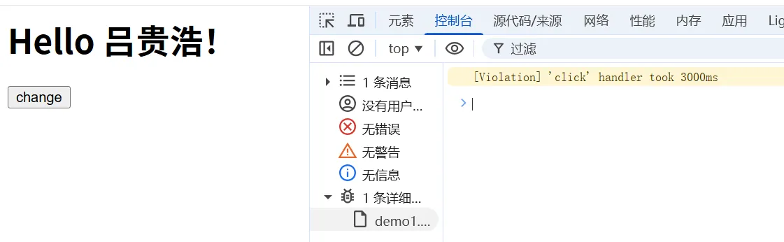 <h1>Hello World!</h1> <button>change</button> <script> var h1 = document.querySelector('h1'); var btn = document.querySelector('button'); // 死循环指定的时间 function delay(duration) { var start = Date.now(); while (Date.now() - start < duration) {} } btn.onclick = function () { h1.textContent = 'Hello 吕贵浩!'; delay(3000); }; </script>
