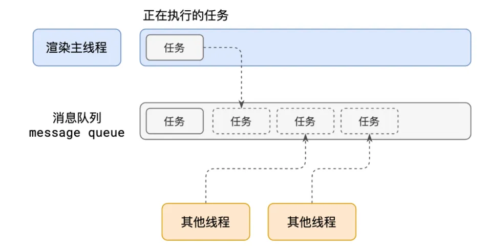 在此过程中,JS执行和页面渲染任务都在渲染主线程上执行。JS执行会影响页面绘制,如果JS某段业务逻辑执行时间很长,会导致绘制任务在消息队列中长时间阻塞。