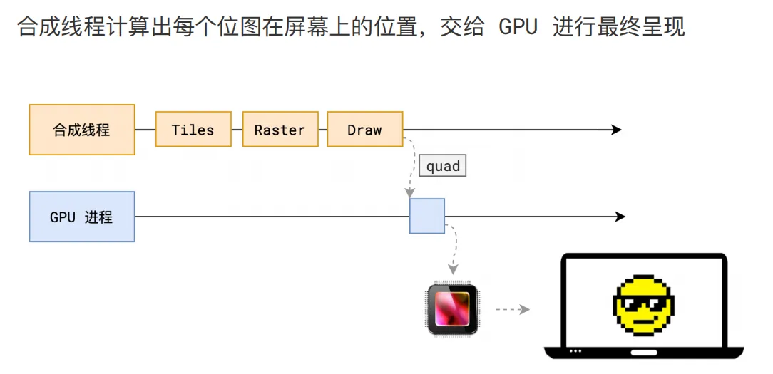 合成线程会把 quad 提交给 GPU 进程,由 GPU 进程产生系统调用,提交给 GPU 硬件,完成最终的屏幕成像。