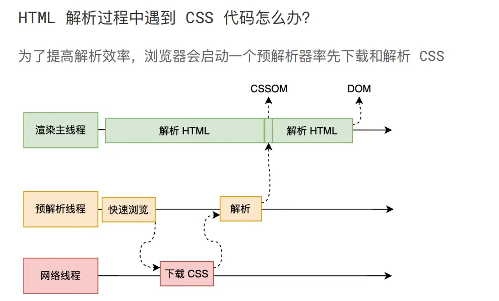 如果主线程解析到link位置,此时外部的 CSS 文件还没有下载解析好,主线程不会等待,继续解析后续的 HTML。这是因为下载和解析 CSS 的工作是在预解析线程中进行的。这就是 CSS 不会阻塞 HTML 解析的根本原因。