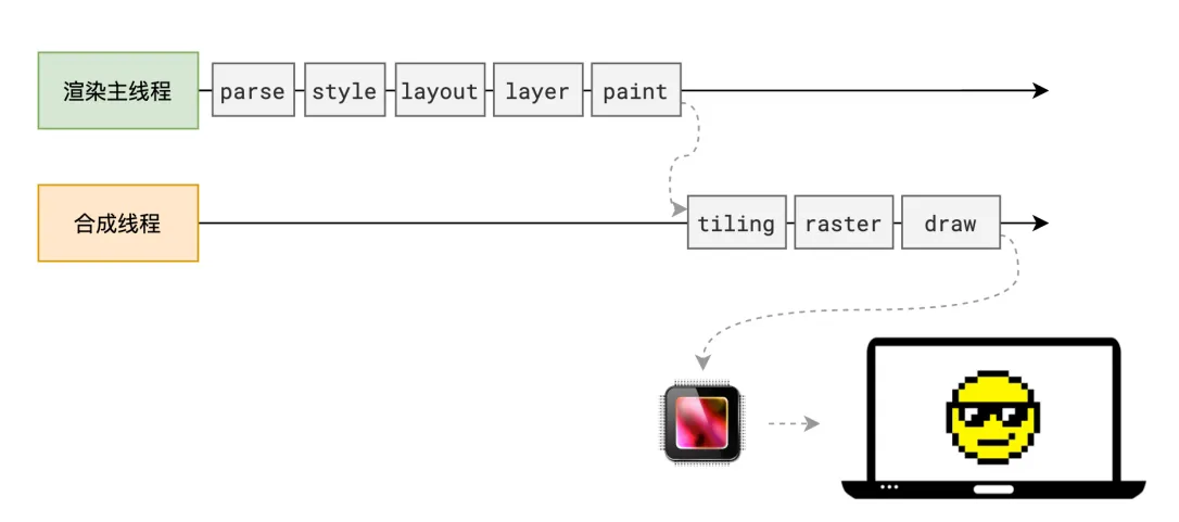 完成绘制后,主线程将每个图层的绘制信息提交给合成线程,剩余工作将由合成线程完成。