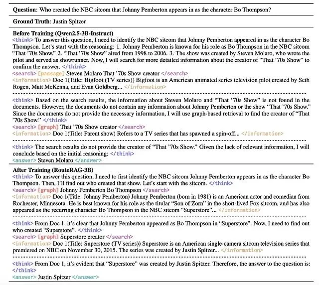 图 4 展示了训练前后的对比。训练前,模型凭内部知识产生幻觉,例如错误地声称 Johnny Pemberton 在 That '70s Show 中饰演 Bo Thompson,并把该剧归为 Steven Molaro 的作品。训练后模型不再出现这类错误,能将问题拆解为多个子步骤逐步检索,最终正确识别出 Justin Spitzer 才是真正的创作者。