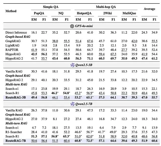 主要发现:RouteRAG 在多跳问答上带来了明显的性能提升,拉高了总体均分,而骨干模型仅是 Qwen2.5–3B-Instruct 和 Qwen2.5–7B-Instruct。多跳问答成绩接近甚至在部分指标上超过了基于 GPT-4o-mini 的图 RAG 系统——图 RAG 基线用的是 GPT-4o-mini,文本 RAG 基线用的是同规格 Qwen2.5——但在简单问答任务上有一定的准确率让步。