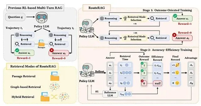 RouteRAG 把检索扩展到段落、图和混合三种模式,训练框架基于 GRPO 分两个阶段:第一阶段只优化正确性,第二阶段加入根据总检索时间计算的效率奖励,鼓励更有选择性的检索行为,同时不牺牲回答质量。