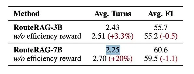 但 RouteRAG 最值得关注的点不在于它又给 RAG 加了个新花样。更有意义的是,模型把"何时检索信息"和"何时给出最终答案"纳入了策略学习的范畴,而非写死在启发式规则里。一个直观的数字:对比没有效率奖励的变体,检索轮次从 2.70 降到 2.25,F1 没有下降。
