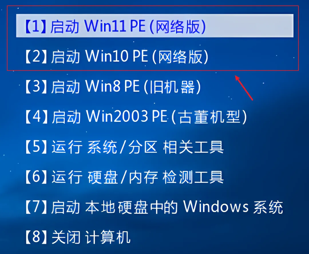 完成后,直接将该U盘连接重装电脑上,再次开机时,会自动进入引导界面,按下数字键:1,就可以打开Win11 PE系统: