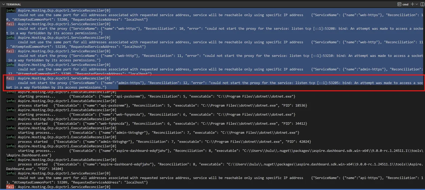 Aspire.Hosting.Dcp.dcpctrl.ServiceReconciler[0] could not start the proxy {"ServiceName": {"name":"api-https"}, "Reconciliation": 17, "error": "could not start the proxy for the service: listen tcp [::1]:53209: bind: An attempt was made to access a socket in a way forbidden by its access permissions."}