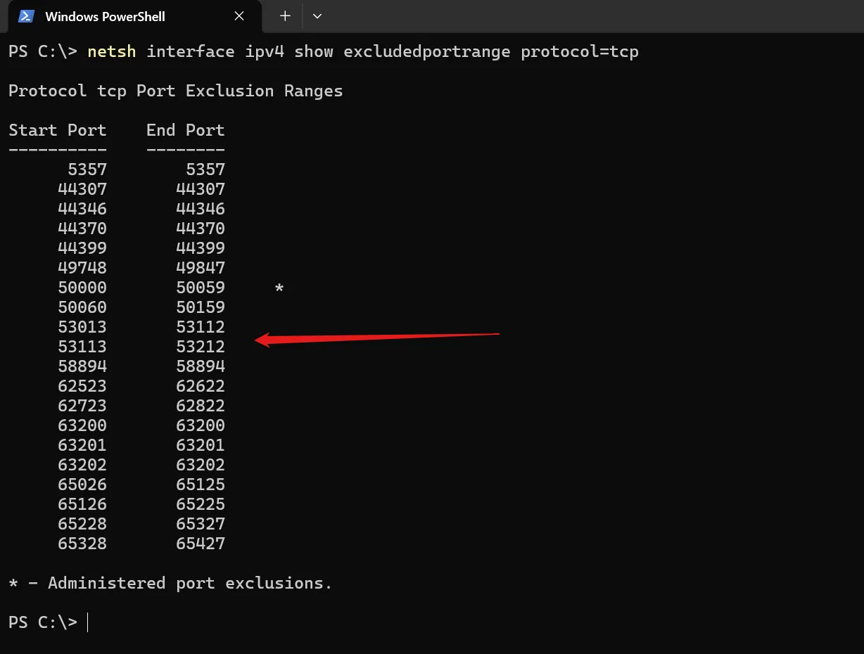 使用 tcp 端口以考虑排除的范围 开始端口 结束端口 ---------- ---------- 49670 49769 49870 49969 53113 53212 * <-- 当前Aspire应用的端口在这个范围内! 65228 65327 65328 65427