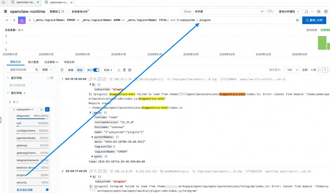 2. 按子系统下钻:在错误日志中叠加字段条件,例如 0.subsystem: plugins,将范围收敛到具体子系统——如下图所示,两步过滤即可快速定位到 diagnostics-otel 插件加载失败的错误日志。