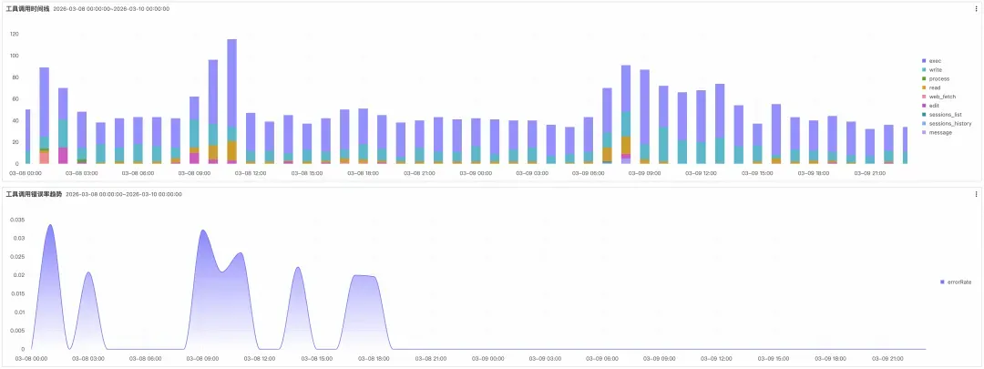 工具调用是 Agent 与外部世界交互的唯一通道,其调用量与错误率的变化直接反映 Agent 的运行健康状态。工具调用时间线按工具类型分色展示各时间段的调用频次构成,异常尖峰是排查问题的第一入口,结合工具类型的构成变化,可快速判断是哪类操作驱动了调用激增。错误率趋势图与调用量时间线共享时间轴。错误率高峰不一定与调用量高峰重合,两者的时间差往往能揭示问题的真实来源:是某类工具在特定时段持续失败,还是某次任务引入了异常的调用模式。