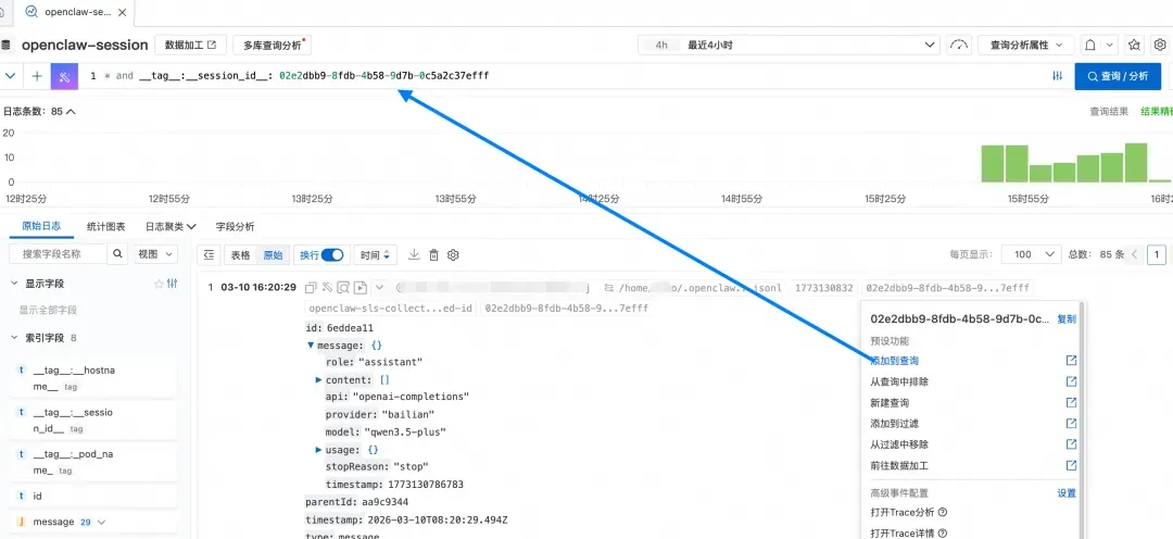 多实例部署环境下,各 OpenClaw 实例的日志集中写入同一 SLS Logstore。自定义探索的第一步是按 Session ID 隔离,将视野收敛到单个会话,明确「谁在何时触发了哪些请求、调用了哪些工具、模型如何响应」,为合规举证提供清晰边界。