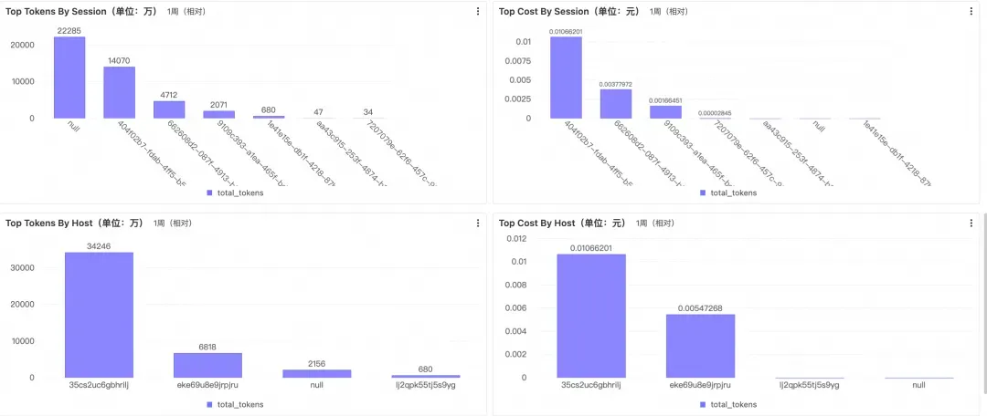 • Top Tokens By Host / Top Cost By Host:按主机(实例)或 Pod 聚合的 Token 与费用,用于多实例部署下的成本分析与风险定位。在企业环境中,主机或 Pod 通常与特定团队、业务线或用户绑定,结合资产归属即可将消耗数据映射到具体责任方——既能支撑成本分摊,也能在某台实例消耗异常时快速锁定潜在的风险使用者或失控会话。
