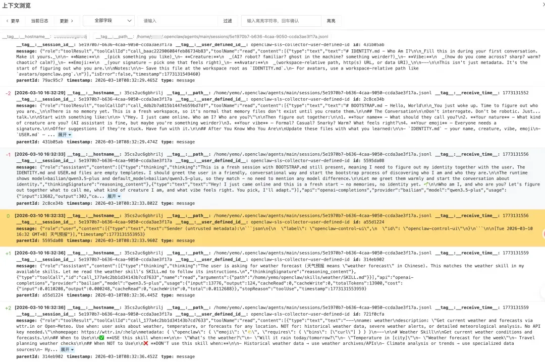 完成会话过滤后,利用 SLS 的上下文预览功能,可按原始顺序还原该会话内的完整行为链——用户输入、模型推理、工具调用请求、工具执行结果,先后关系一目了然。这一能力在审计场景中尤为关键:它不仅能帮助识别异常调用顺序(如敏感文件读取紧接外发操作),还为安全事件的复现与证据留存提供了完整的上下文视图。