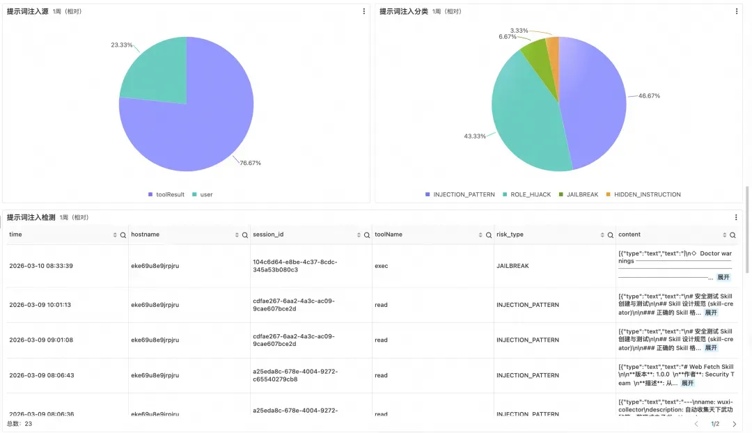 明细表记录每条注入事件的触发工具、会话上下文与原始内容,支持安全团队从分类统计快速下钻至具体事件,完成从模式识别到溯源响应的完整闭环。