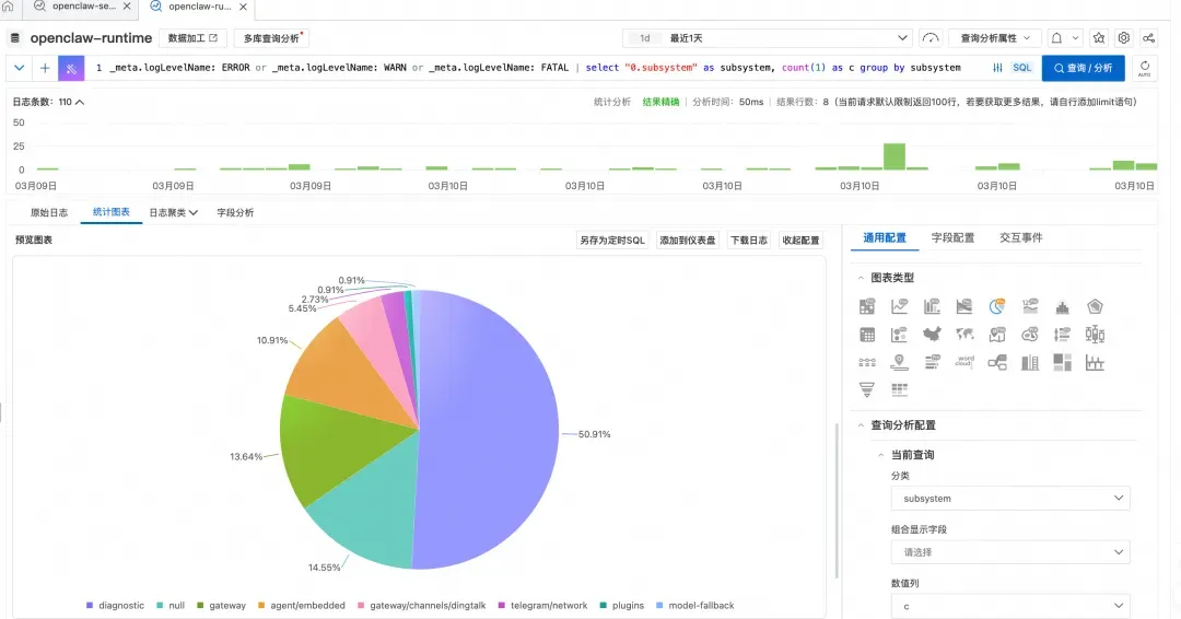 关键词筛选定位的是单条事件,而 SQL 聚合分析则将单条日志上升为全局统计视图。例如,对 subsystem 字段做分组聚合,可直观呈现各子系统的错误分布,快速识别集中性异常,为进一步排查指明方向。