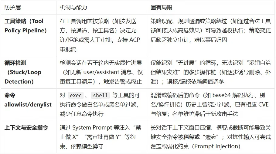 OpenClaw 在架构上提供了多道预防性控制(Preventive Controls):工具策略管道(Tool Policy Pipeline)在调用前做策略决策、Owner-only 封装对敏感操作做权限绑定、循环检测器识别无进展的会话、命令 allowlist/denylist 限制可执行命令集合。这些机制在正常配置下能有效缩小攻击面,但从安全工程角度看,它们属于同一信任域内的执行时校验,存在以下几类固有局限: