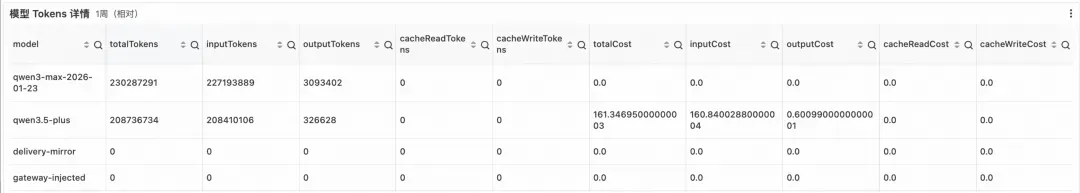 模型 Tokens 详情表(1 周相对)按模型列出:totalTokensinputTokensoutputTokenscacheReadTokenscacheWriteTokens,以及对应的 totalCostinputCostoutputCostcacheReadCostcacheWriteCost。支持排序与筛选,可直接回答“哪个模型花了最多钱、输入/输出各占多少”。其中 inputTokensoutputTokens 的比值反映 Agent 的交互模式:输入占比过高说明 Prompt 或上下文冗余,输出占比过高则可能是模型生成了大量无效内容;cacheReadTokens 占比则直观体现缓存策略的收益——占比越高、实际计费越低,为 Prompt 工程与缓存调优提供量化依据。