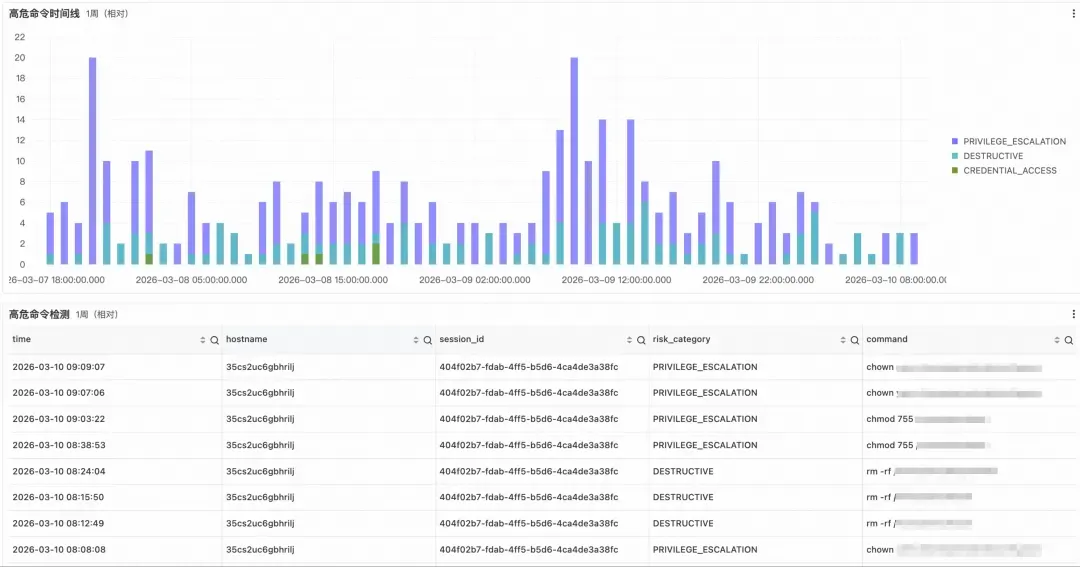 时间线视图的意义不只是计数,而是帮助安全团队识别行为模式。孤立的单次高危命令与短时间内的密集调用,风险含义截然不同。后者往往是 Agent 被操控后系统性执行恶意指令的典型特征,需要立即介入。明细表则提供完整的溯源上下文,支持安全团队从异常信号快速追溯到具体会话与原始命令。
