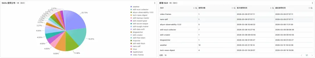 新增 Skills 表格的价值尤为关键。新引入的 Skills 尚未经过充分的安全评估,其权限边界与行为模式对安全团队而言仍是盲区。按首次调用时间逆序排列,可第一时间捕获环境中新出现的 Skills,在其被滥用之前完成审查。
