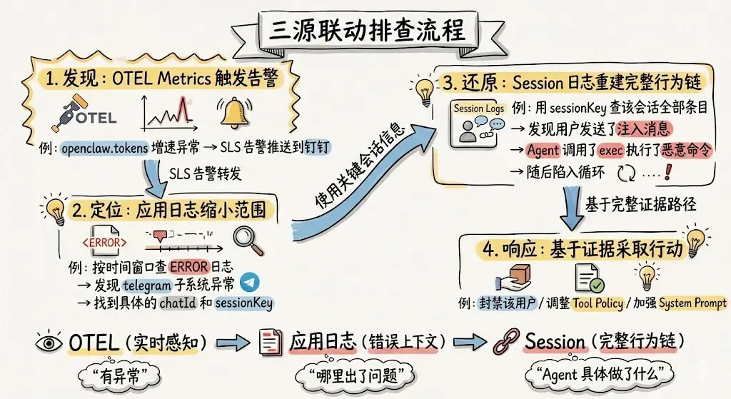 OTEL Metrics → 应用日志(错误上下文)→ Session 审计日志(完整行为链)。典型排查路径如下:OTEL 指标发现异常(如延迟飙升、Token 激增、错误率突增);随即在应用日志中定位对应时间窗口的错误详情(Webhook 超时、认证失败、网关异常);最后下钻到 Session 审计日志,还原该会话的完整工具调用序列、模型交互内容与成本消耗,确认根因并留存审计证据。