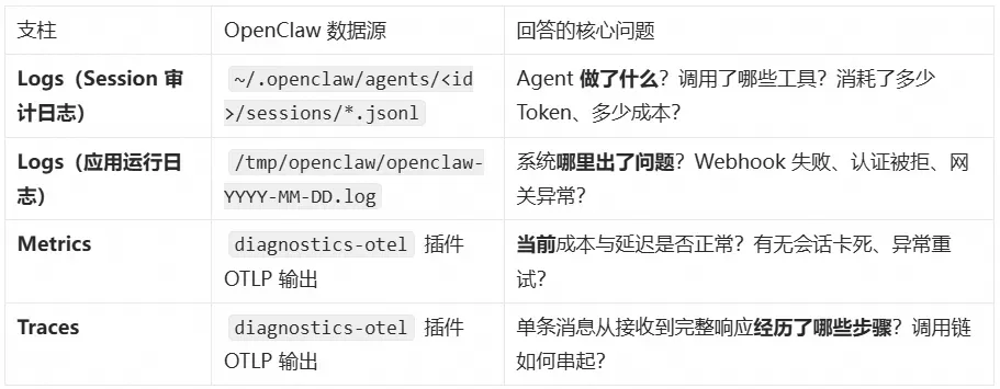 可观测性建立在 Logs + Metrics + Traces 三支柱之上,在 OpenClaw 场景下,三者与数据源的对应关系及各自要回答的核心问题如下: