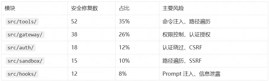 Critical 与 High 合计 50 个,约占明确安全修复的 34%,说明中高危问题在观测窗口内持续被发现与修复。按代码模块分布,风险高度集中在入口与执行层: