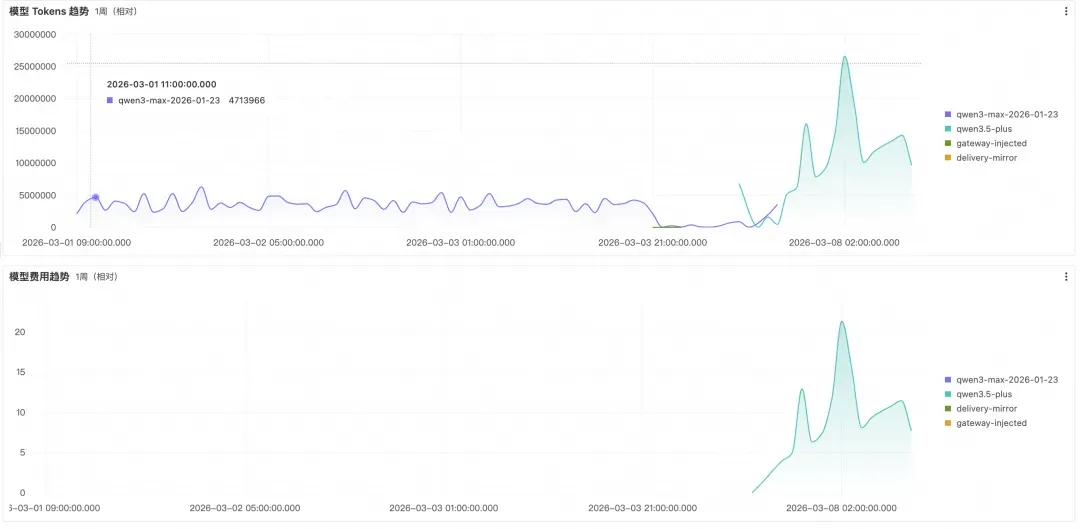 模型 Tokens 趋势与模型费用趋势两条时序图(1 周相对)共享时间轴与图例,按模型分色展示各模型在时间维度上的 Token 消耗与费用变化。需要重点关注的是 Token 激增——这往往不只是成本问题,更可能是安全与稳定性的风险信号:Prompt 注入导致上下文被恶意填充、工具调用陷入死循环、或会话因未触发循环检测而持续膨胀,都会在趋势图上表现为某条曲线的陡峭上升。两张图按模型分色呈现,模型切换会直接反映为颜色构成的变化,无需额外推断即可确认切换时间点与涉及模型,便于判断是否为预期变更。