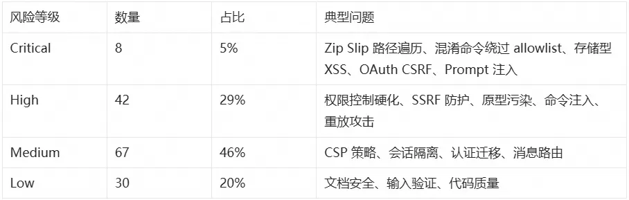 对 OpenClaw 最近 60 天(2026-01-05 至 2026-03-05)的 14,254 个 commits 进行筛选与分类,平均每天约 2.45 个安全修复,得到如下风险等级分布: