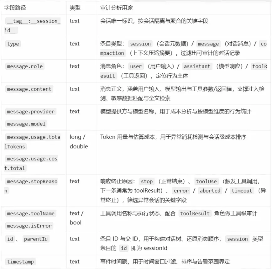 Session 日志是安全审计的核心数据源,记录了每一轮对话、每一次工具调用、每一笔 Token 消耗。