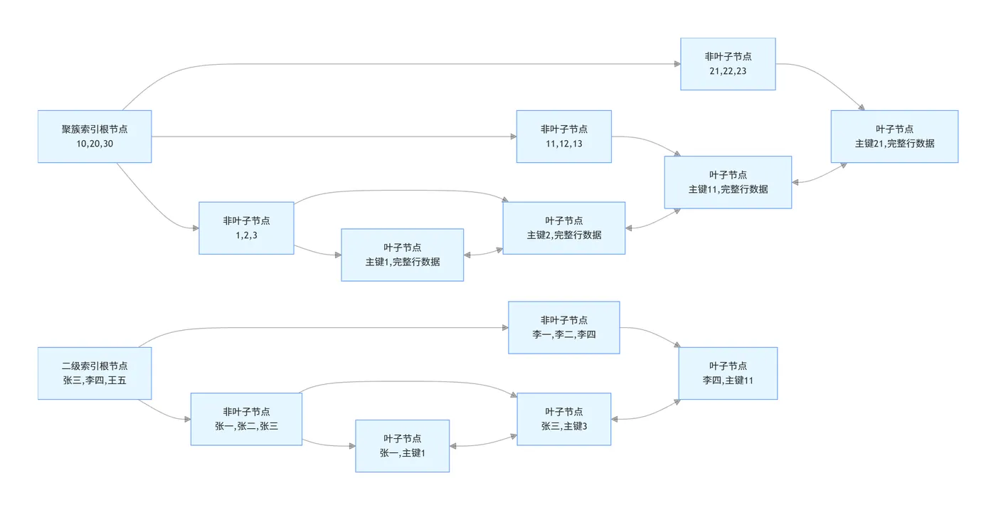 - 二级索引:叶子节点只存储索引键的值和对应的主键值,不存储整行数据。通过二级索引查询时,先通过B+树找到对应的主键值,再通过聚簇索引查找整行数据,这个过程叫做回表。