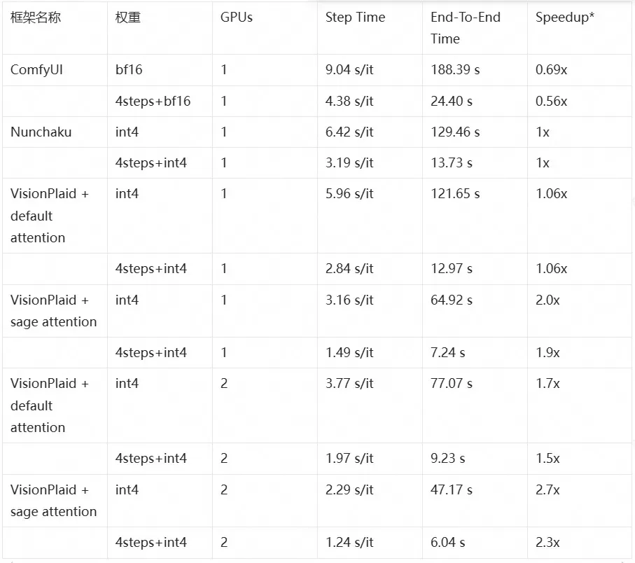 :4-step 配置中使用了 CFG=1.0 的推荐配置; Speedup 分别以 Nunchaku 的两个结果为基准,即 int4 以 int4 为基准,4steps+int4 以 4steps+int4 为基准;* VisionPlaid 的一个优势在于默认可以无重启切换 SageAttention,适合一些长期运行,workload 不固定的 ComfyUI 服务(比如阿里云 FC),这个配置利用了这一点。
