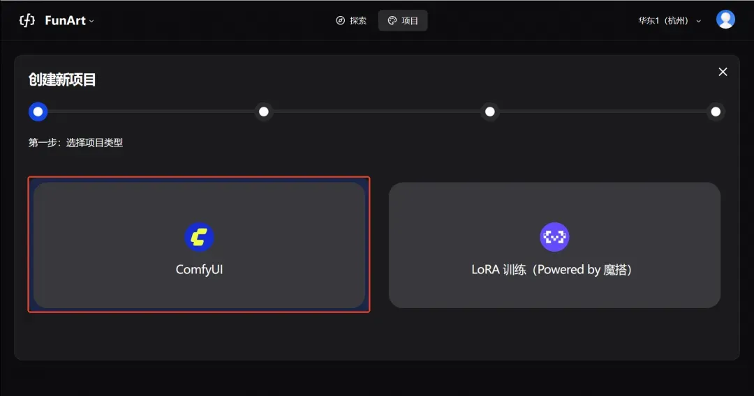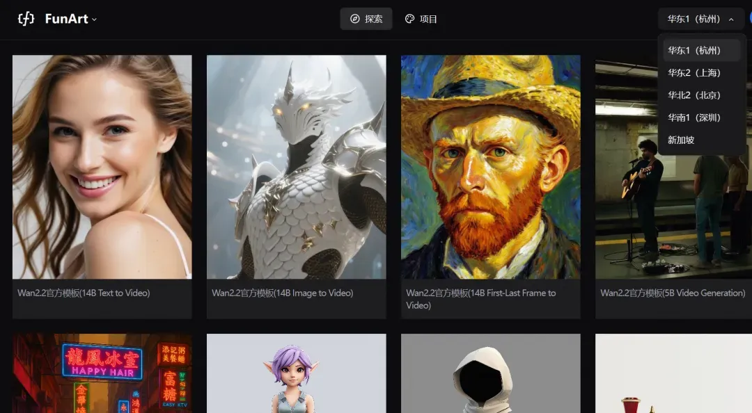 1. 登录 FunArt 控制台(https://functionai.console.aliyun.com/funart/cn-hangzhou/explore ),在右上角切换您希望的地域;