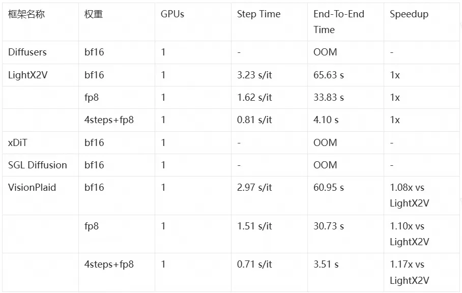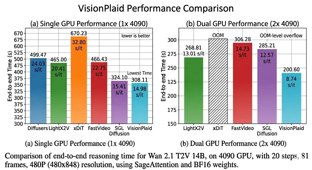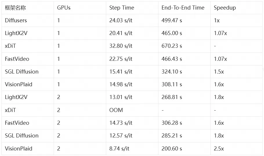 VisionPlaid 的性能优势不仅体现在原始数字上,更重要的是这些性能提升对实际应用的影响。在视频生成领域,与 Diffusers 相比 1.6 倍的单卡加速意味着生成一段视频的时间从 499 秒降至 308 秒,减少了 191 秒的等待时间——这对于需要快速迭代的创意工作者而言是巨大的生产力提升。在双卡配置下,2.5 倍的加速将时间进一步压缩到 200 秒,使得原本需要 8 分钟的任务降至 3 分钟,这在生产环境中可以显著提升吞吐量。