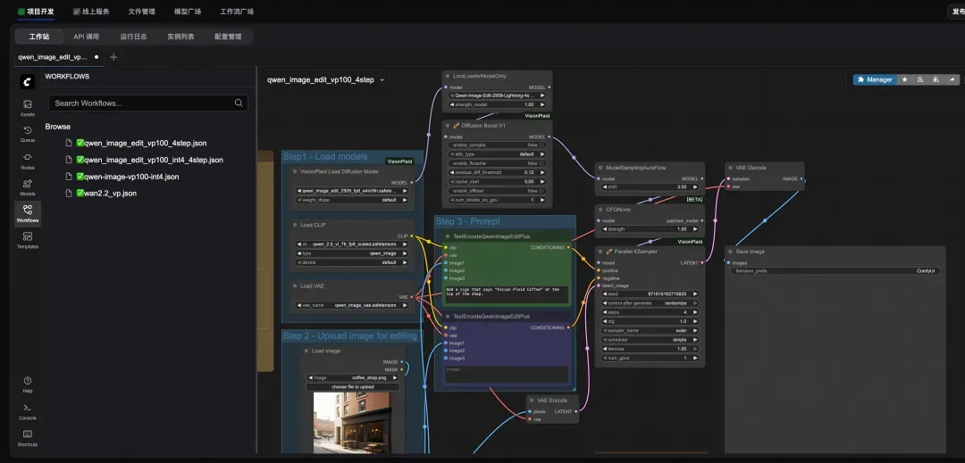 1. FunArt 项目创建完成后,在打开的项目页面里,选择项目开发/工作站/Workflows,可以看到 FunArt 已经内置了几个 VisionPlaid 示例工作流;