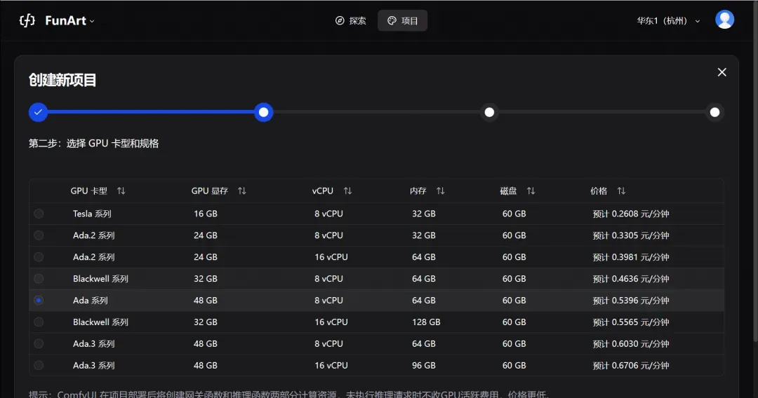 • 第二步选择 GPU 卡型和规格为 Ada.* 系列或者 Blackwell 系列