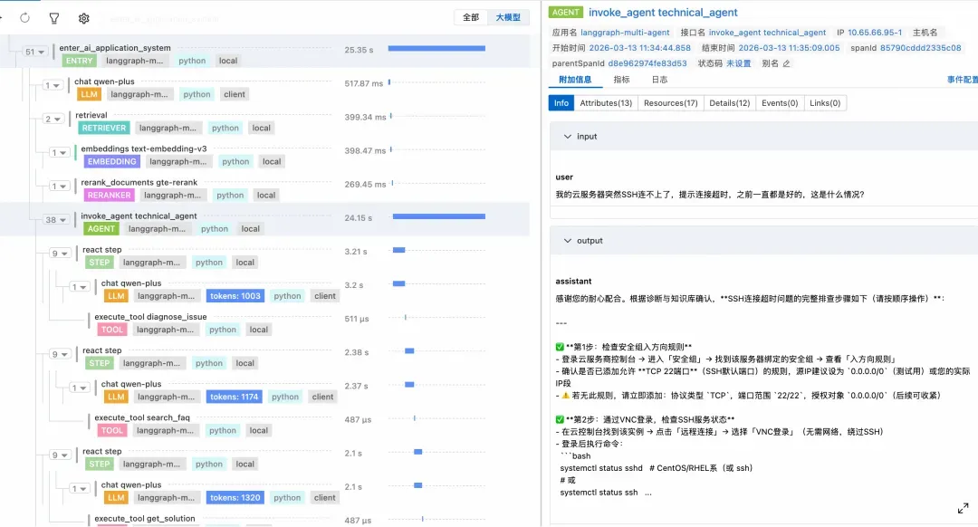 - 完整的调用链:各类大模型调用与常规微服务调用,一目了然;