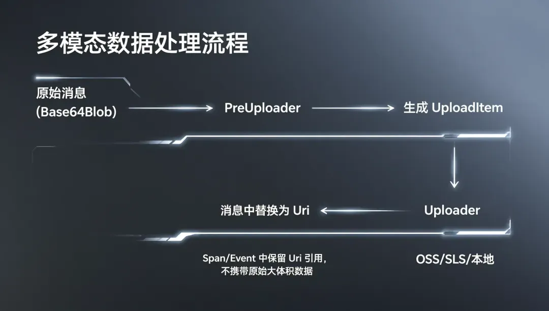 图片、音频、视频等多模态内容体积大,如果直接塞进 span/event,会拖慢链路、增加存储压力。LoongSuite GenAI Util 提供「多模态剥离上传」:把大体积内容异步上传到 OSS/SLS/本地,在消息中只保留可引用的 URI。