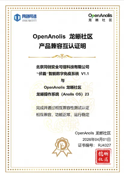 自加入社区以来,同创可信一直在可信计算 3.0 技术融合等方面保持合作。2026 年 4 月,同创“伏羲”系列产品与龙蜥操作系统 Anolis OS 23 完成了相互兼容性测试认证,结果显示:相互兼容、功能正常、运行稳定。其中,Anolis OS 23是龙蜥社区基于开源生态合作倡议推出的上游原生企业级操作系统,采用 Linux Kernel 6.6 LTS 内核并依托 ANCK 6.6 深度优化,支持海光信息、飞腾、龙芯(LoongArch)、兆芯及 x86_64/ARM64 架构。