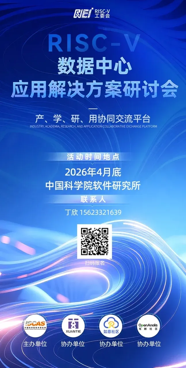 随着 2026 年 RISC-V 高性能服务器产品陆续上市,全球计算基础设施领域正迎来深刻的技术变革。在此背景下,我们诚邀您参加"RISC-V 数据中心应用解决方案研讨会",会议将聚焦高性能服务器整机设计、操作系统适配、编译器优化、存储与网络方案等核心议题,推动 RISC-V 数据中心解决方案加速落地应用,助力我国算力基础设施实现高水平自立自强。