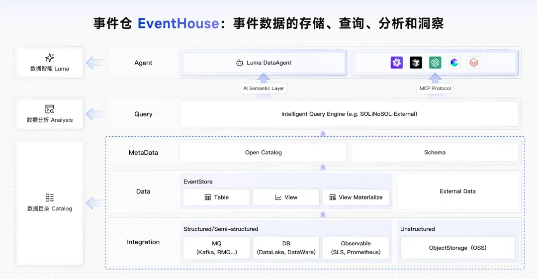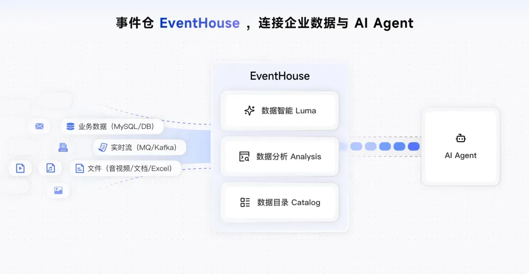 EventHouse 作为企业数据与 AI Agent 之间的桥梁,融合数据湖的开放灵活与数据仓库的高性能治理能力,提供三类关键能力: