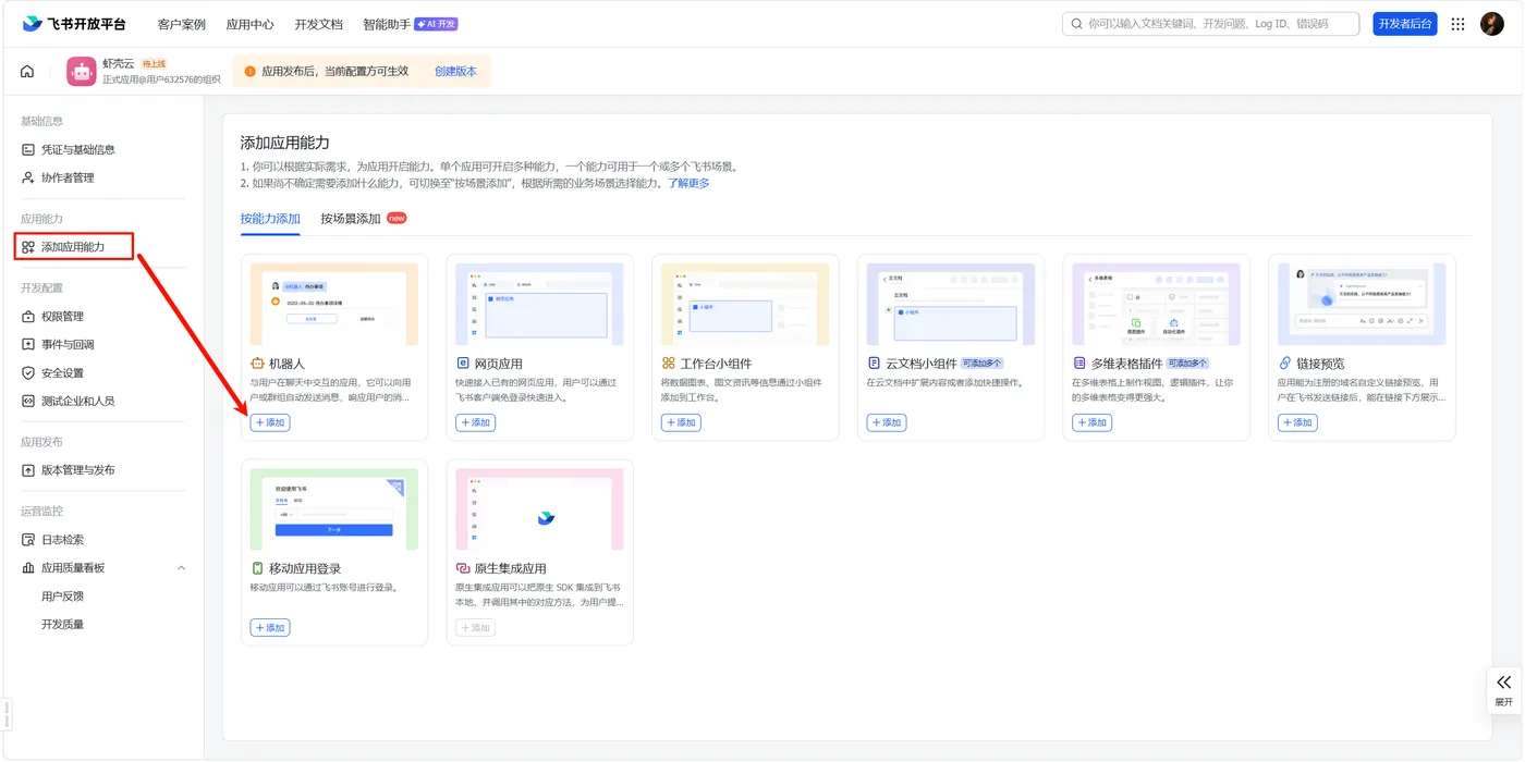 - 进入应用配置页面,在左侧菜单栏找到添加应用能力选项并点击;