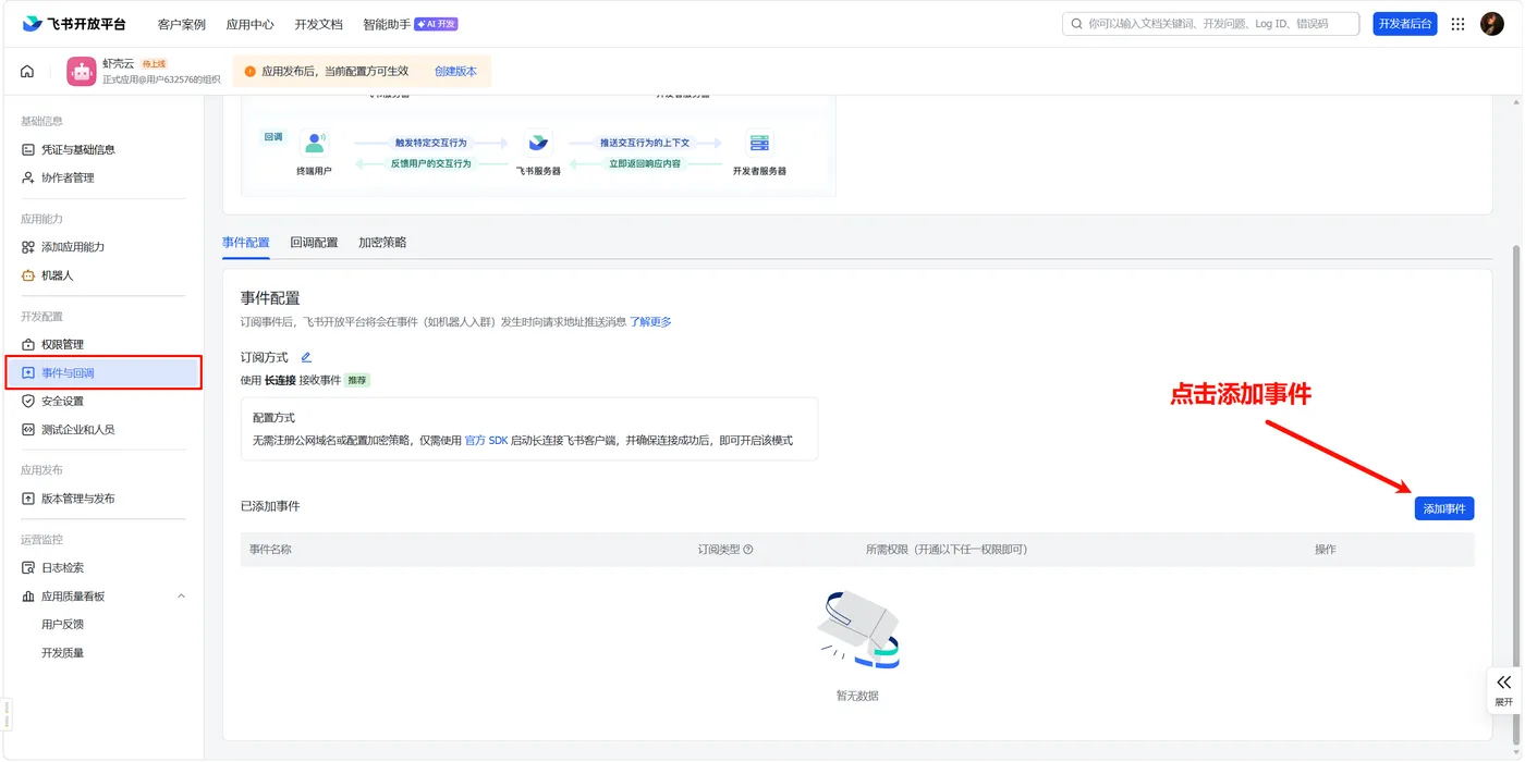 - 在左侧菜单栏进入事件与回调,选择事件配置;